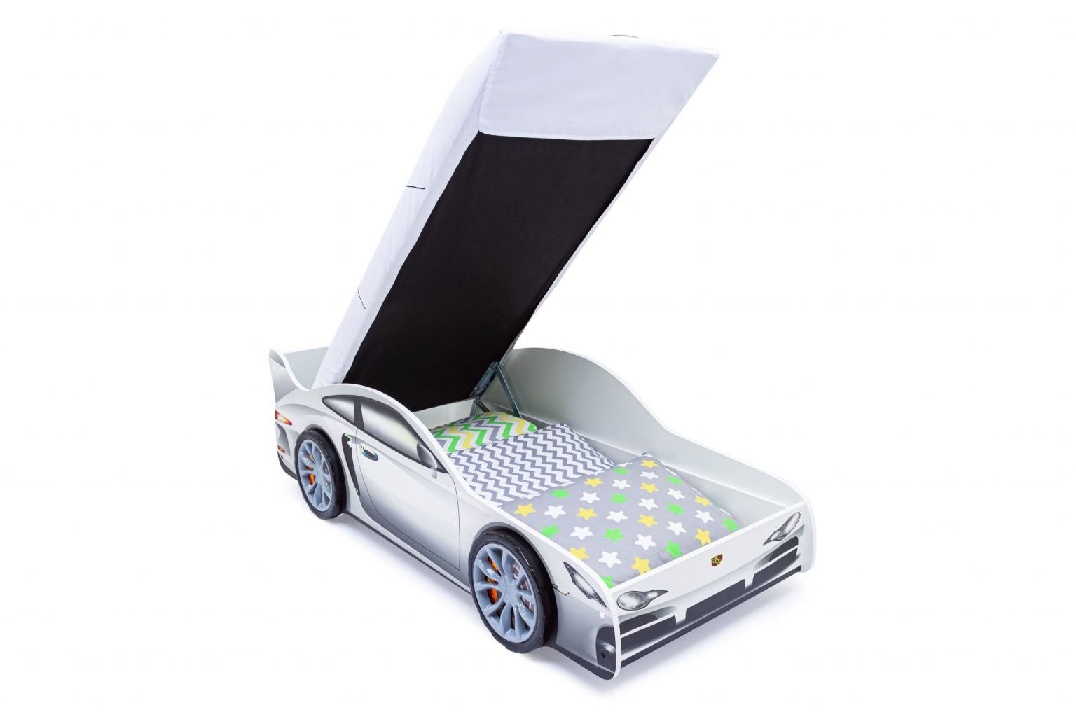 Детская кровать-машина “Порше” с подъемным механизмом станет любимым местом для сна и игр мальчика или девочки от 2 до 10-12 лет.