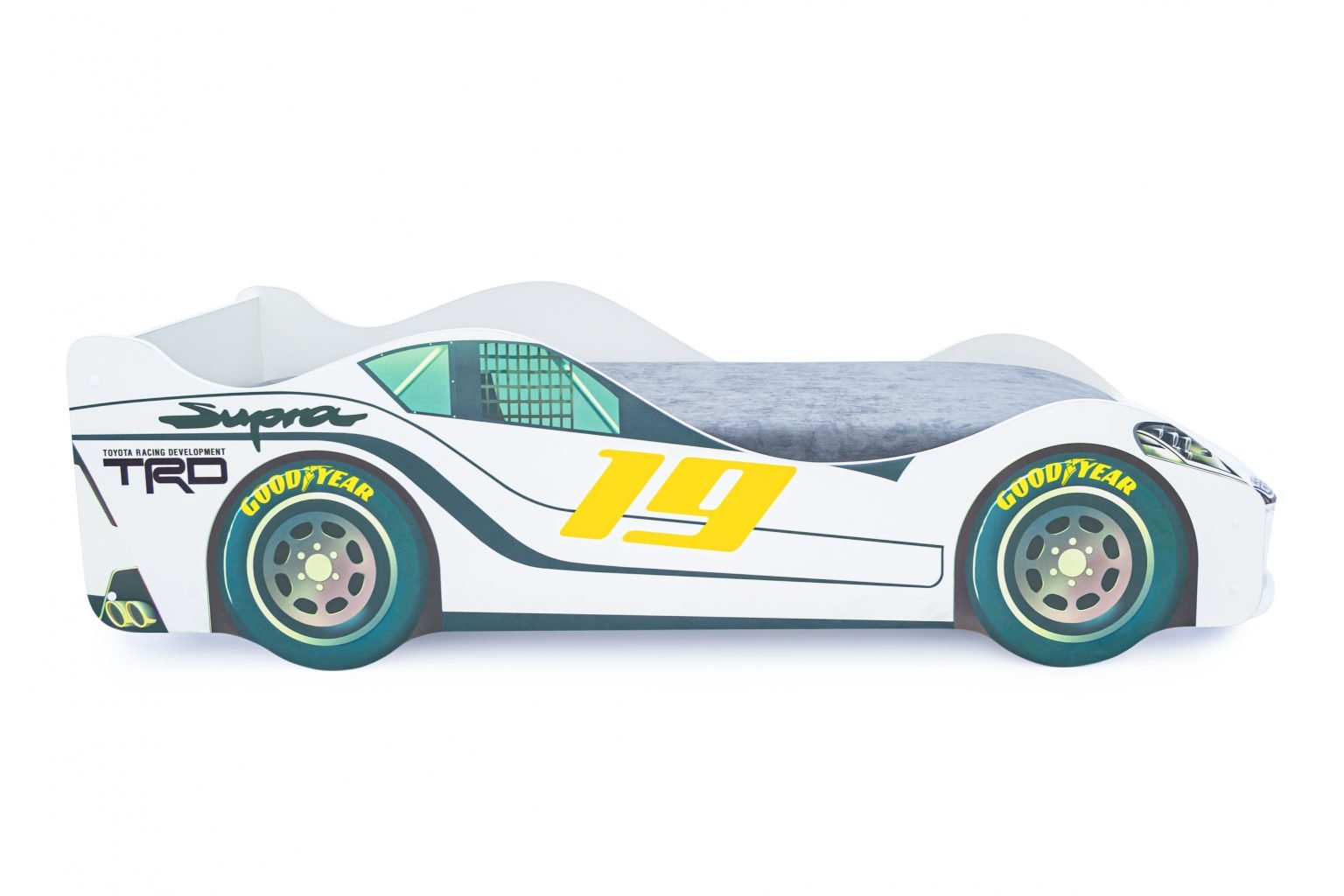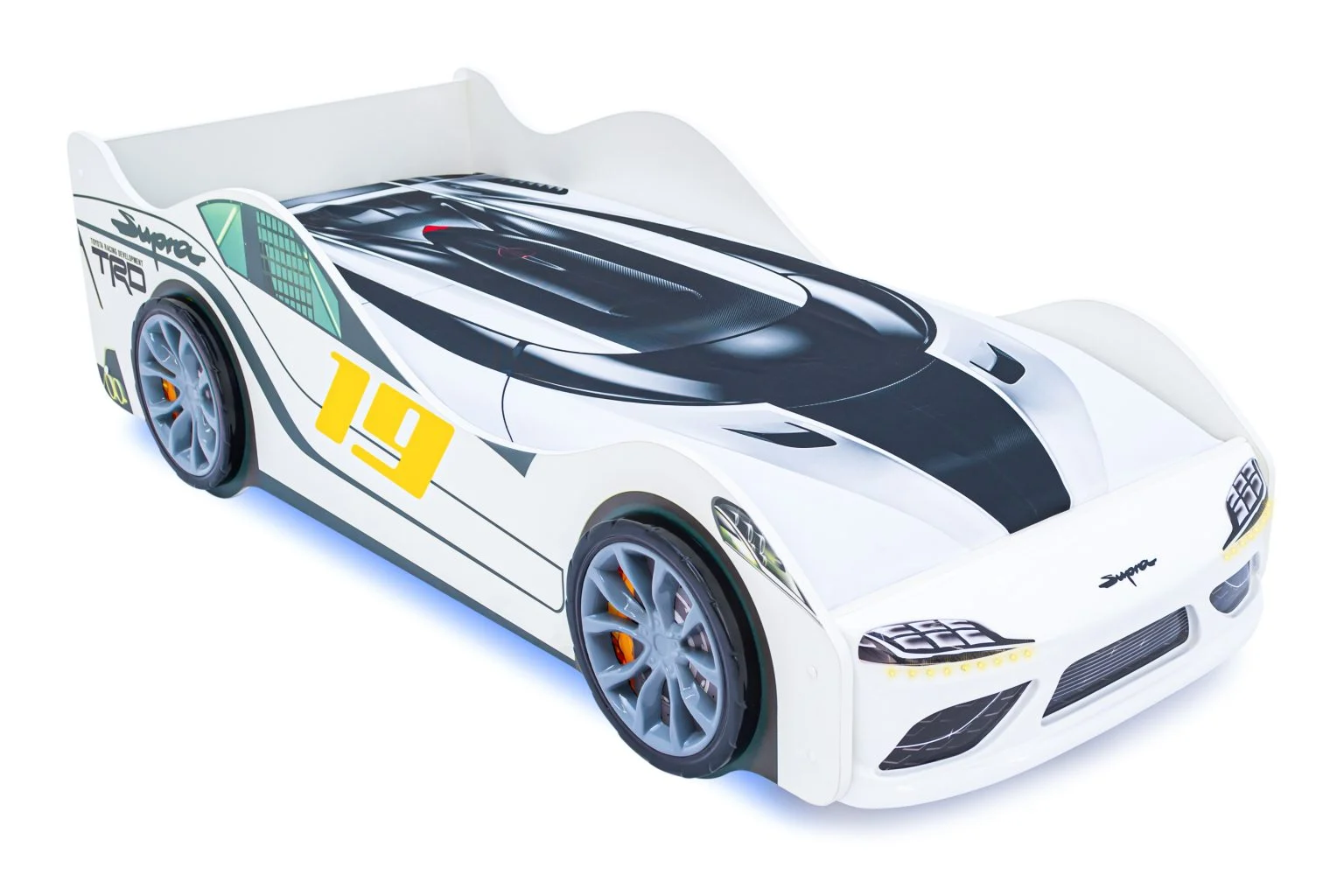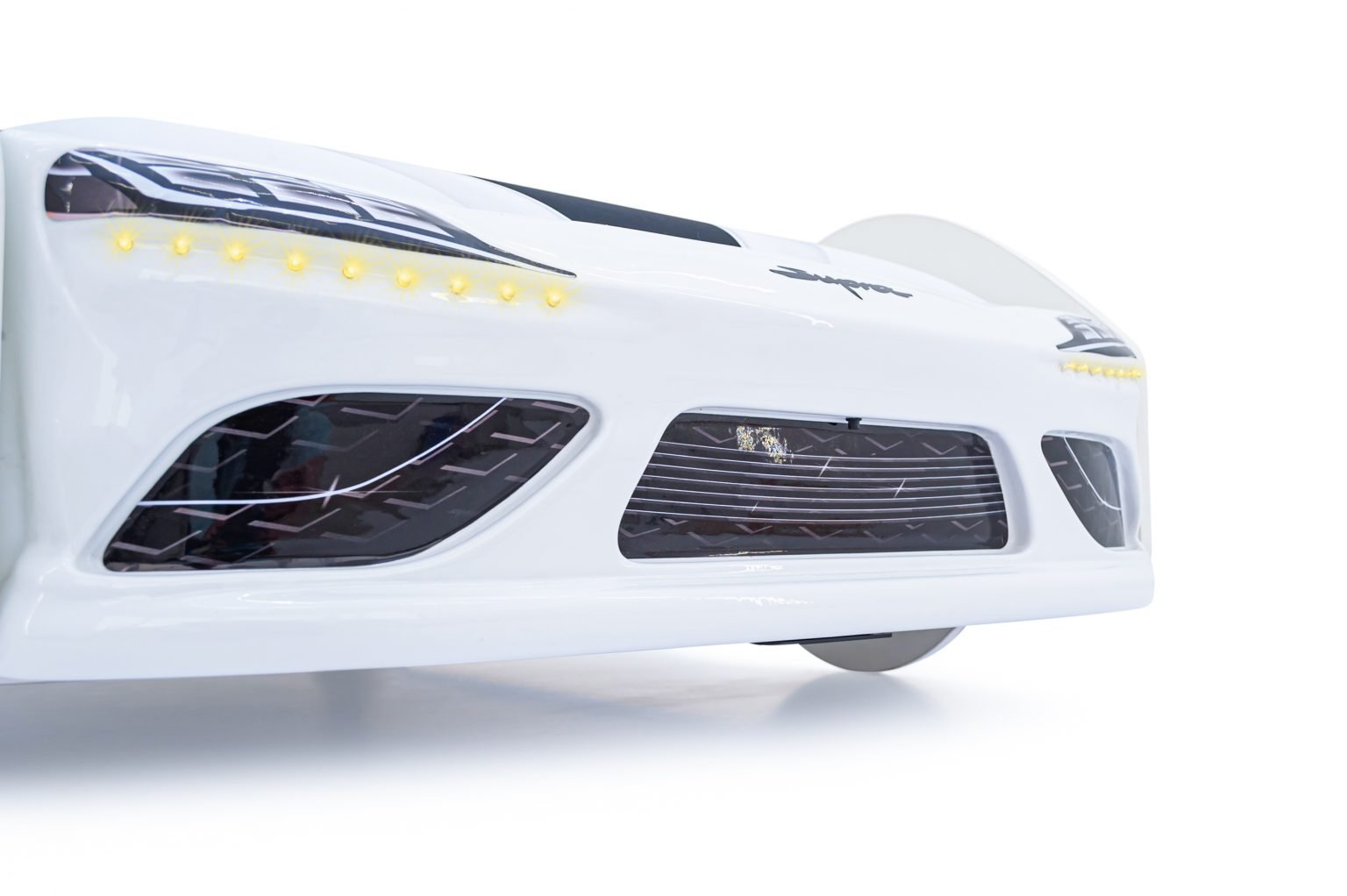 Детская кровать-машина “Супра” белая с подсветкой фар станет любимым местом для сна и игр мальчика или девочки от 2 до 10-12 лет.