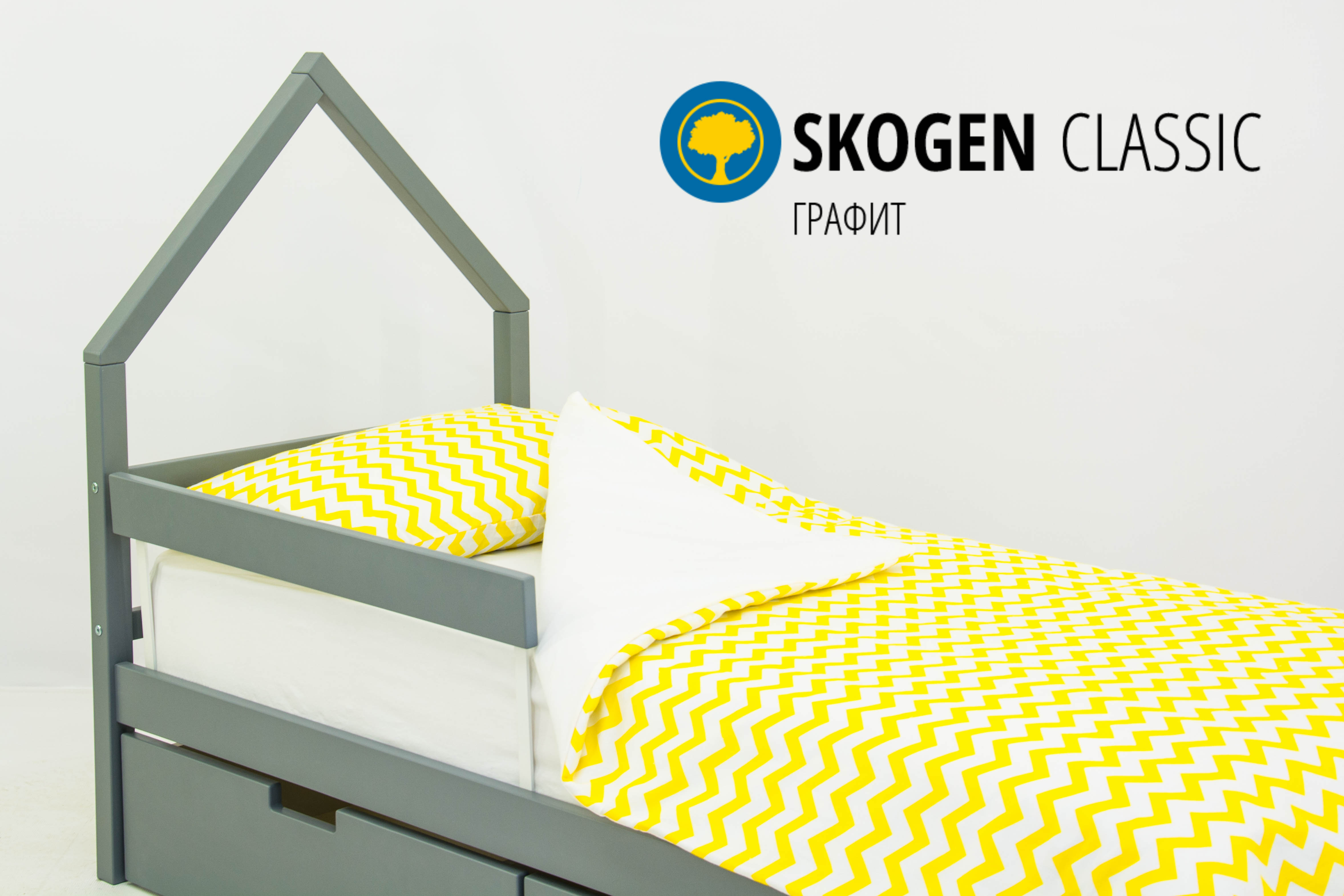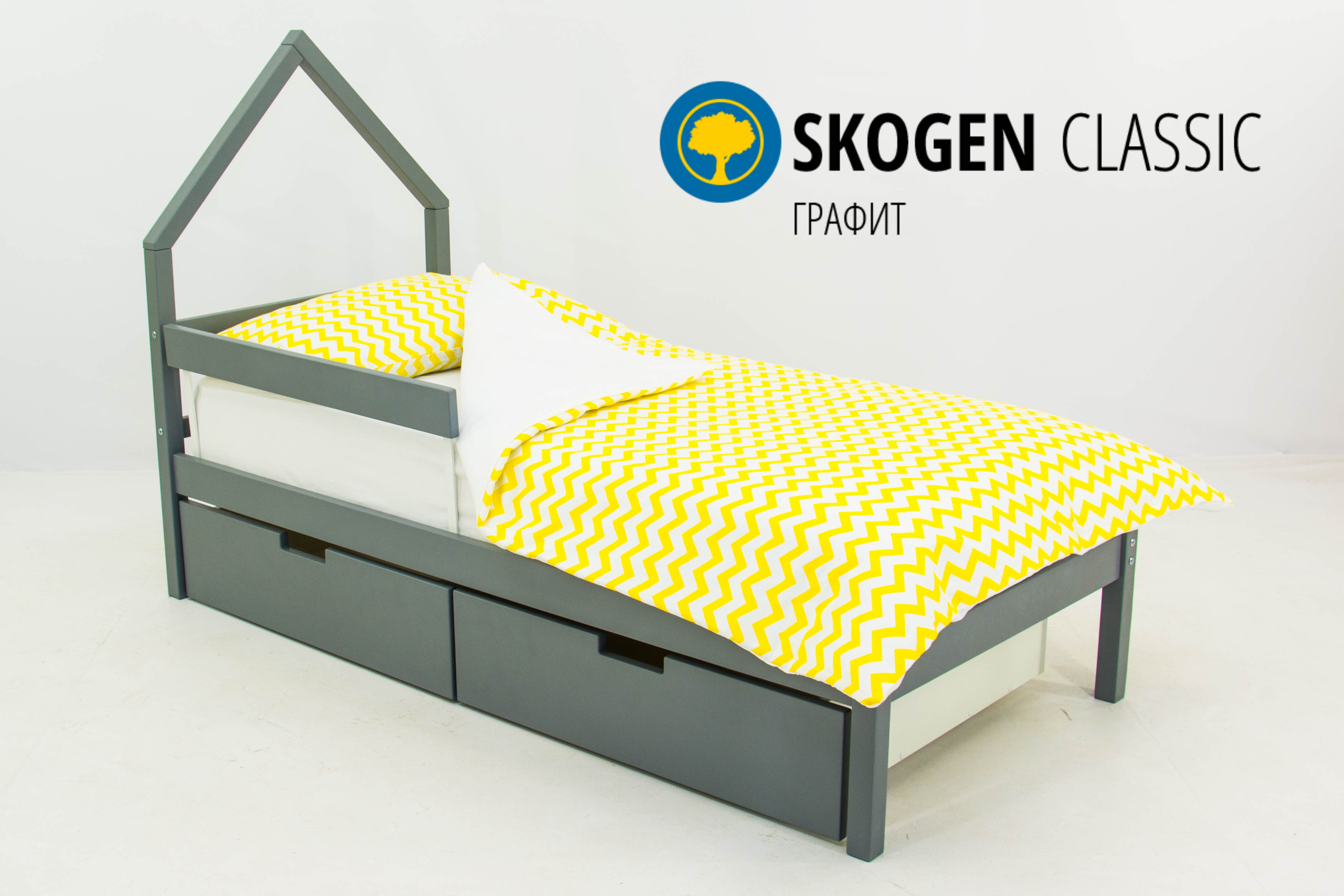 Экологически безопасный материал из натуральной сосны, соответствующий всем ГОСТовым нормам, не только безопасен для ребенка, но и отличается долговечностью, прост в эксплуатации и влагостоек, а дополнительный низкий бортик не только не даст маленькому непоседе выпасть из кроватки во время сна, но и позволит ему самостоятельно забираться в кроватку. Снизу могут располагаться два вместительных ящика для размещения постельного белья или же детских игрушек (комплект ящиков является дополнительным аксессуаром и не входит в стандартную комплектацию). Кровать-домик мини «Skogen дерево-белый» оснащена простой инструкцией по сборке, которую можно осуществить в течение 10 минут.