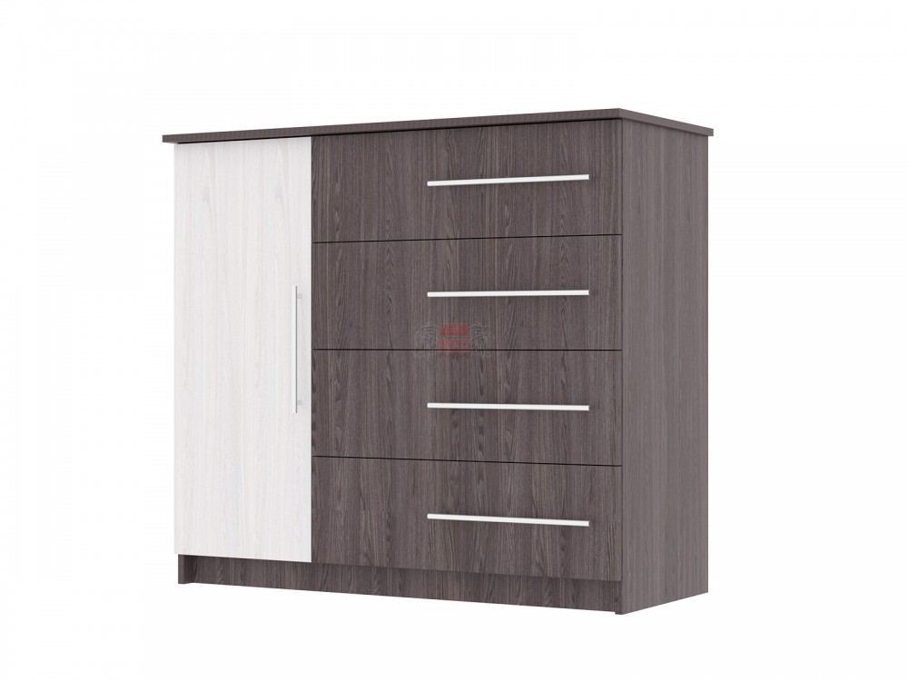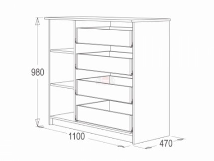 Комод имеет 4 выдвижных отдела и вертикальные сектора с полками, закрытыми дверцей.