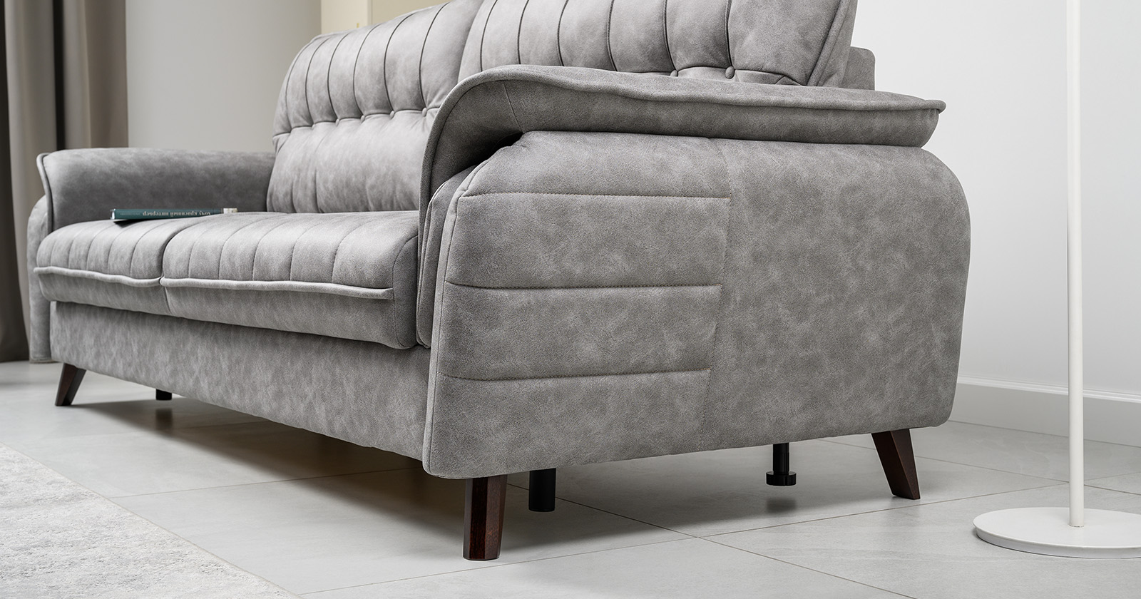 Декоративные канты на подушках дивана, подлокотниках и сиденье. Стежка на передней части сиденья и внешней части подлокотника. Защипы на верхней части подушки. Втяжки с пуговицами на приспинных подушках.