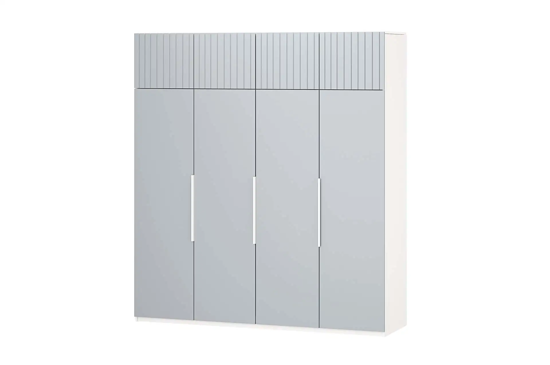 Распашной четырехстворчатый шкаф с функциональной шириной 2000 оснащен штангами, полками и выдвижными ящиками. Фасады МДФ в цвете Лайт Грей Софт и антресоли с фрезеровкой придадут особый шарм любому интерьеру.