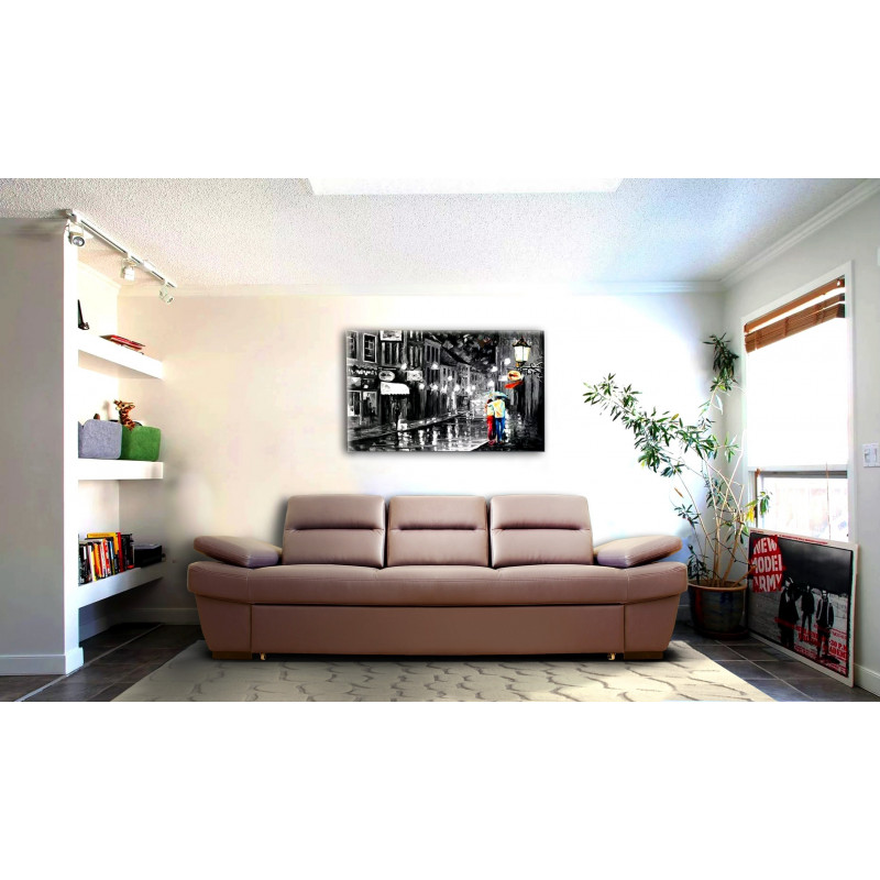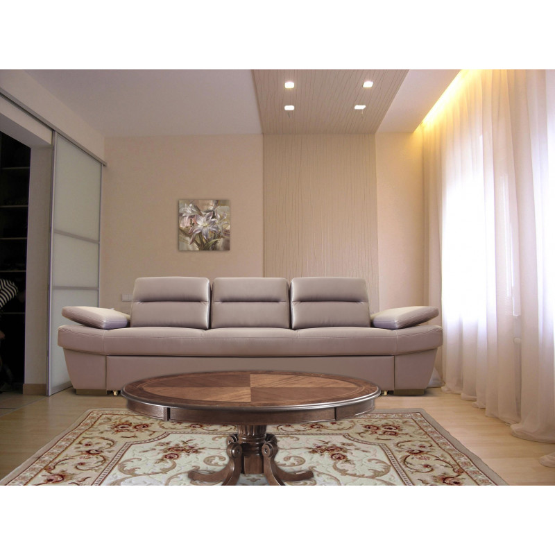 При общем размере 2700**1050 мм его ширина каждого сиденья составляет 65 см, диван состоит из трех удобных сидений. Высота модели от пола до верхней линии спинки 90 см, а высота до сиденья 45 см, приспинные подушки имеют высоту 45 см. Вся конструкция установлена на устойчивые, прямоугольной формы, ножки оптимальной 4 см высоты.